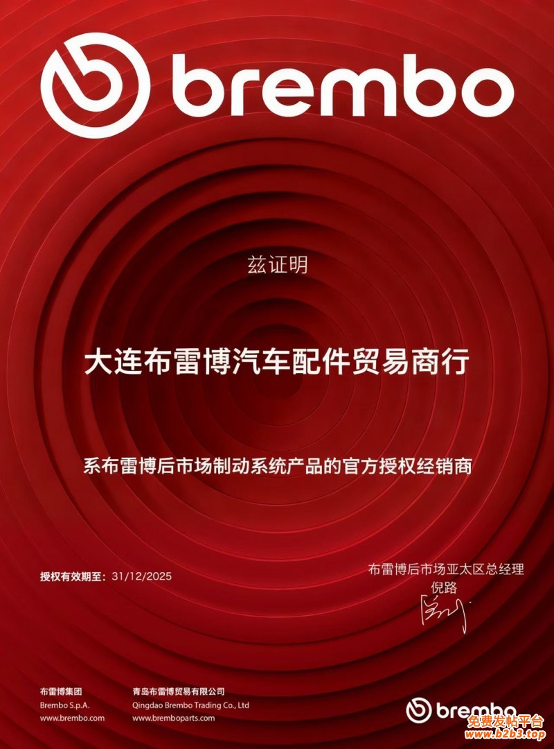 - 区域批发代理:面向海外汽配城、改装工坊招募二级代理商,提供 “授权背书 + 技术培训 + 售后支持” 的一体化服务,依托 Brembo 官方合作伙伴身份保障代理商市场竞争力。