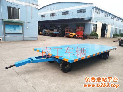6吨无动力叉车牵引平板拖车 蓝色,佛山南工车辆长期非标订制,牵引平板拖车无动力,主要用于码头、工厂、港口等场区内运输。