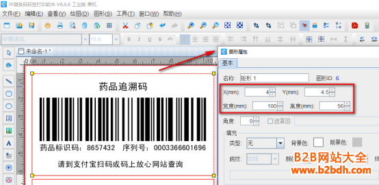 4. 在第一个药品追溯码外面添加一个矩形框作为定位使用 点击软件左侧的“绘制圆角矩形”按钮,在白色画布上绘制一个矩形框,设置矩形框的宽度(100mm)和高度(56mm),X(距离软件左侧的距离)为4mmY(距离软件顶部的距离)为4.5mm,然后点击软件顶部的“不可见”按钮,将矩形框设置成不可见状态。